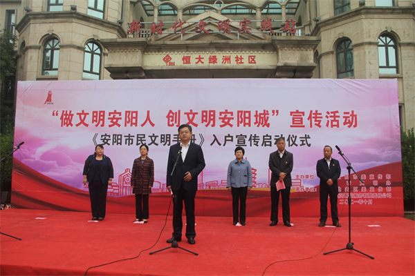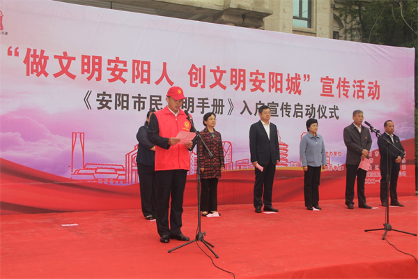 儀式上,公司志愿者李俊峰代表北關(guān)區(qū)志愿者進(jìn)行“爭做文明市民”宣誓,市衛(wèi)健委陳美紅代表文明單位表態(tài)發(fā)言,薛崇林、張玲、李志弘、車俊朝、路錄平、王洪忠為市、區(qū)各單位代表發(fā)放《安陽市民文明手冊》。