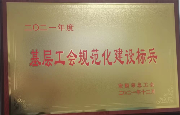 近日,公司工會(huì)被安陽(yáng)市總工會(huì)授予“2021年度安陽(yáng)市基層工會(huì)規(guī)范化建設(shè)標(biāo)兵”榮譽(yù)稱號(hào)。