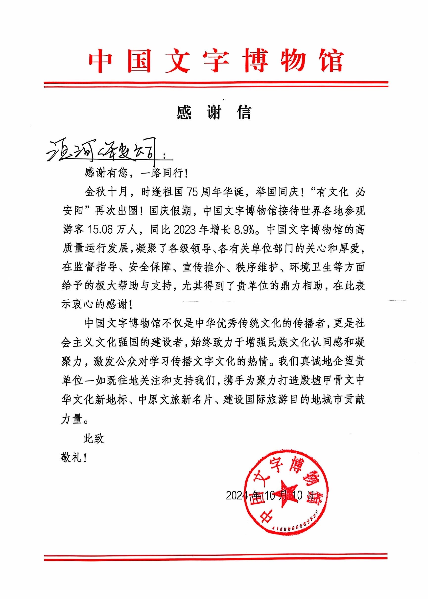 10月12日,中國文字博物館安全保衛(wèi)部主任孫琳杰專程來到我公司,送來一封感謝信,以此感謝今年國慶期間公司在安全保衛(wèi)工作中所付出的努力和作出的貢獻(xiàn)。此次國慶期間,中國文字博物館接待世界各地參觀游客15.06萬人次,參觀人數(shù)多、時(shí)間長、影響面廣,公司全體保安員盡職盡責(zé),嚴(yán)格落實(shí)各項(xiàng)安保措施,以飽滿的熱情和敬業(yè)的工作態(tài)度,為博物館安全作出了積極貢獻(xiàn)。