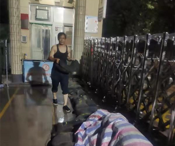 零點(diǎn)五十分,雨勢(shì)突然變大,短短十幾分鐘的雨量,已經(jīng)把學(xué)校門口的慢車道全部淹沒(méi),積水馬上就要涌入校園。雨情就是警情,汛情就是命令。防汛排險(xiǎn),刻不容緩。何濤立刻打上雨傘,開(kāi)始用防汛沙袋封堵大門,由于雨下的很急,雨傘多次被打落,他直接把雨傘扔到一邊,雙手搬起了沙袋,很快便壘起了一面沙墻,及時(shí)將雨水堵在校門之外。