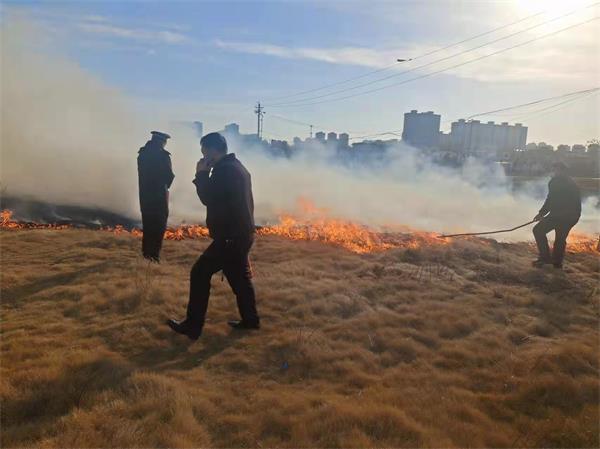 當(dāng)日(陰歷辛丑臘月年三十),是辭舊迎新的日子,也是民間傳統(tǒng)習(xí)俗上墳祭祖的日子,駐殷墟商魂廣場(chǎng)保安隊(duì)員在班長(zhǎng)郭國(guó)峰的帶領(lǐng)下,像往常一樣堅(jiān)守在崗位上。下午15時(shí)20分許,正當(dāng)他們準(zhǔn)備交接班時(shí),忽然發(fā)現(xiàn)殷墟廣場(chǎng)南邊冒起滾滾黑煙,繼而冒起熊熊火焰。“不好,著火啦!”班長(zhǎng)郭國(guó)峰召集隊(duì)員李世印、肖鵬,急忙拿起滅火器趕赴現(xiàn)場(chǎng)。由于離火場(chǎng)距離遠(yuǎn),郭國(guó)峰迅速拿起兩罐滅火器騎車(chē)趕去。彼時(shí)由于風(fēng)太大,火焰向前蔓延很快,郭國(guó)峰指揮隊(duì)員先用滅火器斷開(kāi)草地火焰,再用鐵鍬撲滅余火,經(jīng)過(guò)大家?jiàn)^力撲救終于將火撲滅??伤麄冞€沒(méi)來(lái)得及喘口氣,發(fā)現(xiàn)廣場(chǎng)西邊草坪又燃起大火。