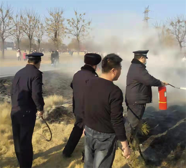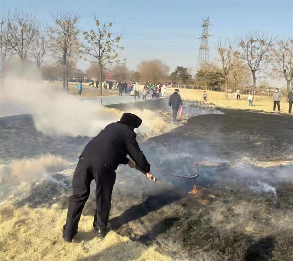 2月19日下午4點,人防四大隊殷都區(qū)文廣新局保安班長王俊峰和隊員郝彥軍像往常一樣,按照規(guī)定的線路執(zhí)行安保巡邏,當(dāng)他們在殷墟門口巡邏執(zhí)勤時,發(fā)現(xiàn)殷墟廣場前草坪上冒起濃濃黑煙,有火險,他們隨即趕到火險現(xiàn)場,班長王俊峰和郝彥軍隨手撿起地上的木棍進(jìn)行滅火,王俊峰通知郝彥軍趕快上報殷墟警務(wù)室,殷墟警務(wù)室王隊長得知后,立即帶領(lǐng)警務(wù)室所有隊員拿著滅火器趕到現(xiàn)場進(jìn)行滅火。由于發(fā)現(xiàn)及時,在大家的共同努力下,將草坪上的明火撲滅。