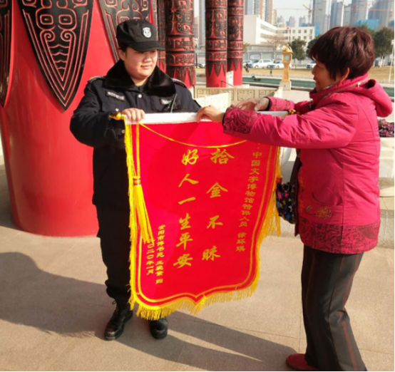 “感謝特保隊(duì)員,你們的品德太高尚了,你們讓我相信了還是好人多?!?020年1月1日,家住博書(shū)苑的王愛(ài)素女士一看到特保大隊(duì)派駐在中國(guó)文字博物館的隊(duì)員徐環(huán)琪,便激動(dòng)地說(shuō)出這番話(huà),并將一面寫(xiě)有“好人一生平安,拾金不昧”的錦旗,送到徐環(huán)琪手中。這是怎么一回事呢?