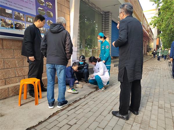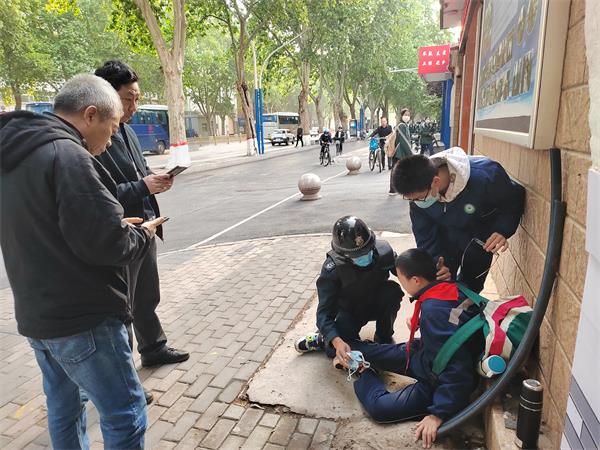 當天早上6:58分,正值上學早高峰,閆永勝、張健正在市二十中學門口維持入學秩序,突然看到一名七年級學生在校門西側摔倒,另一名學生迅速攙扶,隨即與該校值班人員上前查看,只見摔倒學生手捂腹部,面色蒼白、且有虛汗,不宜貿然挪動。見此情形,他們立即撥打120急救電話,并通知其班主任和家長。期間,張健和另一位送孩子上學的家長拿出甜面包和糖喂食。120急救車到來后,學校值班人員隨車前往醫(yī)院,班主任及家長幾分鐘后也迅速趕往醫(yī)院。急救車離開后,張健將學生書包、自行車等物品放置門崗妥善保管。