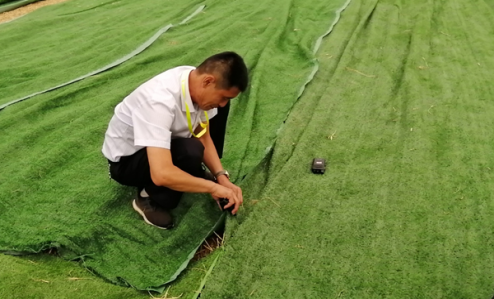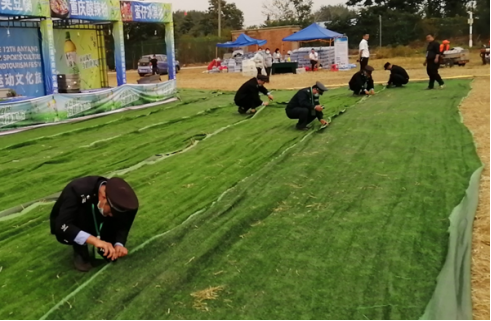 被抽調出的執(zhí)勤人員分工合作,有的負責鋪平草坪地毯,有的負責將地毯用訂書釘釘在一起,大家干得熱火朝天。經(jīng)過2個多小時奮戰(zhàn),13500平方米凌亂的草坪地毯再次整整齊齊鋪在了主會場??蛻艨吹胶?,直夸我們的保安員真能干。