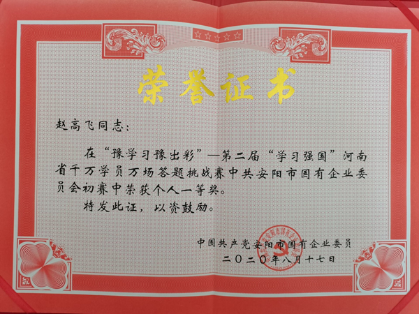 對(duì)于平時(shí)怎樣學(xué)習(xí),趙高飛有自己的學(xué)習(xí)心得,他認(rèn)為,學(xué)習(xí)要貴在勤奮、貴在鉆研、貴在有恒,每天早上第一件事,就是打開學(xué)習(xí)強(qiáng)國(guó)平臺(tái),翻閱感興趣的時(shí)事新聞和行業(yè)動(dòng)態(tài),完成每天的學(xué)習(xí)任務(wù),從不占用工作時(shí)間學(xué)習(xí),都是在上班之前就完成了。對(duì)于參加比賽如何獲得好的成績(jī),趙高飛有一套自己的學(xué)習(xí)竅門。一是要堅(jiān)持,每天堅(jiān)持把當(dāng)日學(xué)習(xí)積分做完,總結(jié)學(xué)習(xí)方法和學(xué)習(xí)技巧。二是勤練習(xí),四人賽、雙人對(duì)戰(zhàn)是關(guān)鍵,要勤練習(xí)各個(gè)答題模塊,熟能生巧。三是有訣竅,他整理出一整套學(xué)習(xí)題庫(kù)達(dá)5000多題,并利用碎片時(shí)間翻看熟記于心,他把各種類型的題分類總結(jié),錯(cuò)題、易錯(cuò)題收藏起來(lái),反復(fù)練習(xí)、各個(gè)擊破,最終,他克服一切困難,集中一切精力用5個(gè)小時(shí)時(shí)間,通關(guān)“強(qiáng)國(guó)總題庫(kù)”共4202題。四是重交流,他加入了“學(xué)習(xí)強(qiáng)國(guó)”全國(guó)學(xué)習(xí)聯(lián)盟、“學(xué)習(xí)強(qiáng)國(guó)”河南學(xué)習(xí)聯(lián)盟等學(xué)習(xí)微信群,和學(xué)習(xí)達(dá)人們一起探討答題經(jīng)驗(yàn)和技巧
