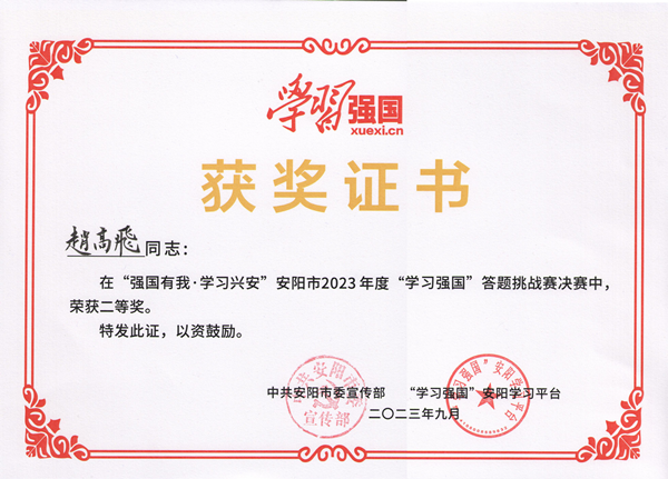 趙高飛,35歲,中共黨員,本科學(xué)歷,現(xiàn)任鼎信子公司副經(jīng)理,自“學(xué)習(xí)強(qiáng)國(guó)”平臺(tái)上線以來(lái),趙高飛學(xué)習(xí)成績(jī)屢創(chuàng)新高,先后榮獲2020年度學(xué)習(xí)強(qiáng)國(guó)挑戰(zhàn)賽安陽(yáng)市賽區(qū)決賽“個(gè)人三等獎(jiǎng)”,2021年度安陽(yáng)市黨員干部在線答題競(jìng)賽“個(gè)人三等獎(jiǎng)”,2022年度學(xué)習(xí)強(qiáng)國(guó)河南學(xué)習(xí)平臺(tái)“喜迎二十大、中原更出彩”答題比賽“周達(dá)人”及“學(xué)習(xí)達(dá)人”,2023年度“強(qiáng)國(guó)有我 學(xué)習(xí)興安”學(xué)習(xí)強(qiáng)國(guó)答題挑戰(zhàn)賽安陽(yáng)市決賽“個(gè)人二等獎(jiǎng)”,2023年度學(xué)習(xí)強(qiáng)國(guó)河南學(xué)習(xí)平臺(tái)“貫徹二十大精神、建設(shè)現(xiàn)代化河南”強(qiáng)國(guó)答題比賽“周達(dá)人”。學(xué)習(xí)從來(lái)都不是一蹴而就的,這些成績(jī)的獲得,是趙高飛日積月累堅(jiān)持學(xué)習(xí)的成果。