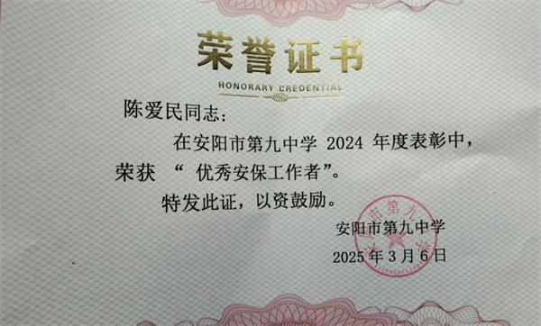 3月6日下午,安陽市第九中學舉行2024年度工作表彰大會,人防三大隊派駐該校保安員陳愛民獲得“優(yōu)秀安保工作者”榮譽稱號。